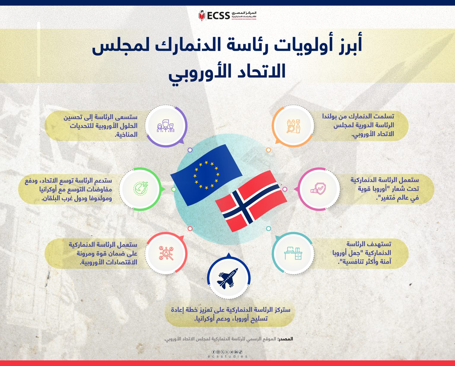يسلط الانفوجراف الضوء على الأولويات الرئيسية لدنمارك خلال رئاستها الدورية لمجلس الاتحاد الأوروبي -للمرة الثامنة- لمدة ستة شهور، ابتداء من الأول من يوليو 2025 وحتى نهاية العام الحالي.