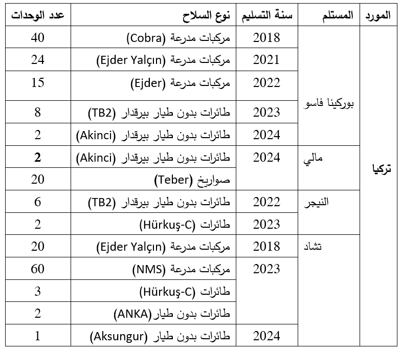 جدول يوضح صادرات أسلحة مختارة من تركيا إلى دول الساحل (2018- 2024)