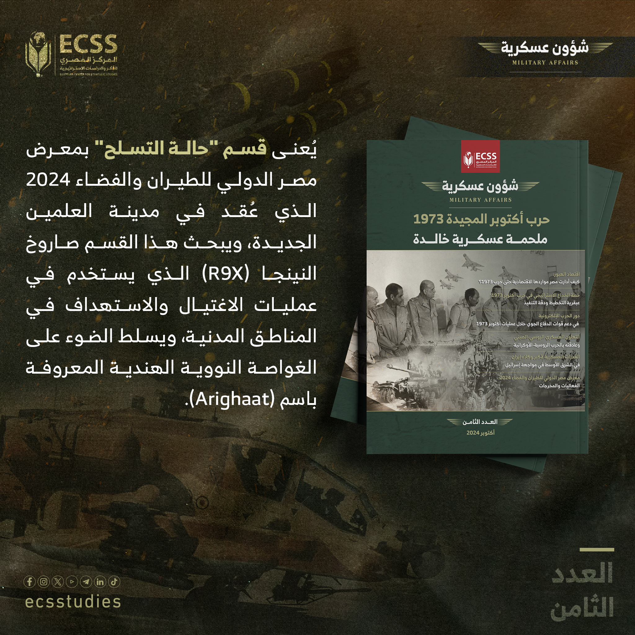 يتناول العدد الثامن من الإصدار الدوري “شؤون عسكرية”، الأبعاد العملياتية والاقتصادية لحرب أكتوبر المجيدة 1973، وتداعياتها على التخطيط العالمي والتاريخ العسكري، كما يناقش اتفاقية التعاون الأمني والعسكري بين مصر والصومال، والتعاون العسكري الروسي الصيني، والقدرات العسكرية لأكبر وكلاء إيران في الشرق الأوسط، مع تسليط الضوء في باب “حالة التسلح”، على أبرز التقنيات العسكرية الدولية.